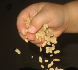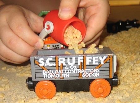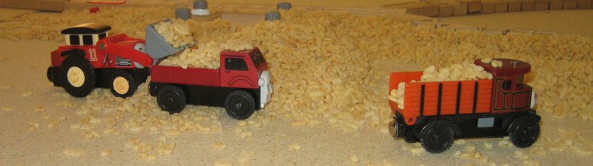 The barrel car got started with picking up rocks from the side of the track...