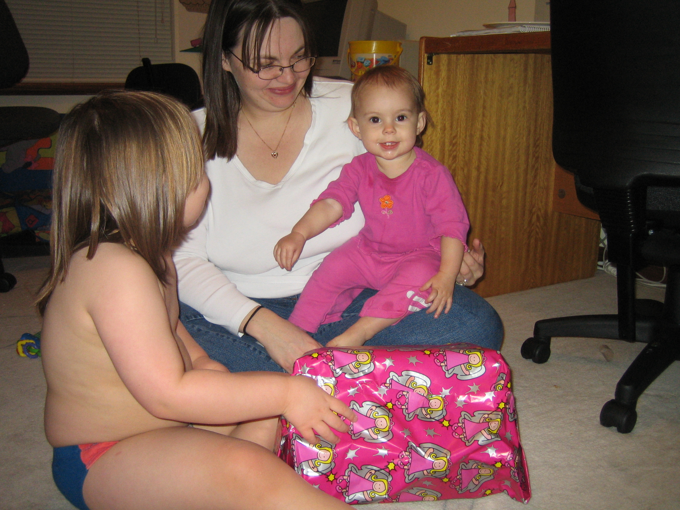 Me helping Emily open her first birthday present on 22 Jul 2007