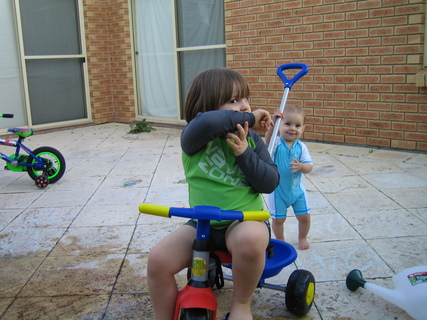 Emily trying to push me on the trike on 24 Aug 2007